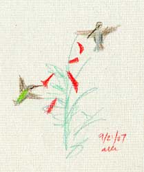 The Anna’s has been feeding in the California fuchsia out front for over a month. I caught it today as I was about to leave to come back to work — it’s the same bird, different angle. This plant is the perfect shape for feeding hummingbirds and it blooms heartily late in the summer when almost nothing else is… but I’ve ordered a hummingbird feeder for when it finally stops.