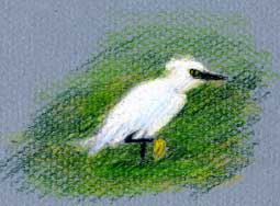 I quickly noticed a snowy egret in with them (whiter, sleeker, taller, black bill, yellow feet). After a couple of sketches in color I tried this black and white. The bird moved out of view quickly but I was able to finish the shading because of all the cattle egrets still there, whose plumage is almost identical…