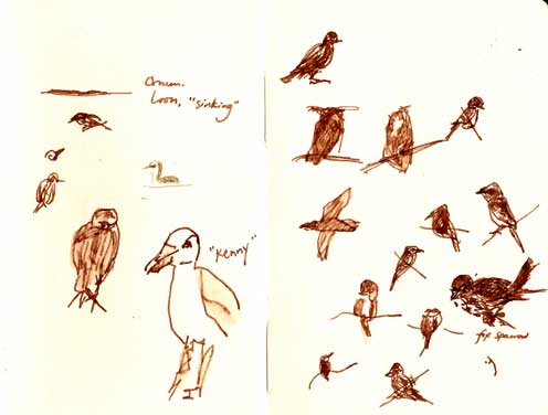 I went on a Yolo Audubon trip yesterday to Bodega Bay and Point Reyes. Fall migration is in full swing. It was good to see birds that have become very scarce, like wandering tattler, along with my old friends in Bodega Bay, the pelagic cormorants; the single willet along the bay shoreline, the single red-necked phalarope in the rail pond where Kevin found the prairie warbler; the startling blackpoll at Diekman’s. Point Reyes was not windy and we saw lots of yellow warblers and a smattering of other warbler species, but mostly this was the first “organized” bird trip I’d been on since I started Bird by Bird. I sketched, as Richard might put it, my brains out.