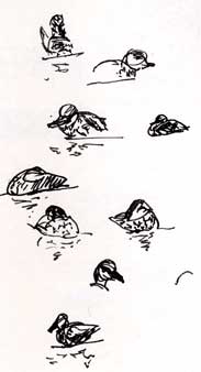 possible garganey, pen and ink The “garganey” was easier to see, out on a pool with some shovelers. It was quite far away and hard to draw but I did a few sketches, these at right and some in colored pencil I wasn’t happy with.