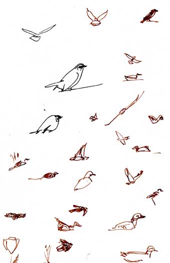 I didn’t want to drive to Berkeley: New Year’s Eve is not the time to be on the road. So we took the train. Having resolved to do a Big Green Year (BIGBY) I started drawing what birds I could see from the train window.