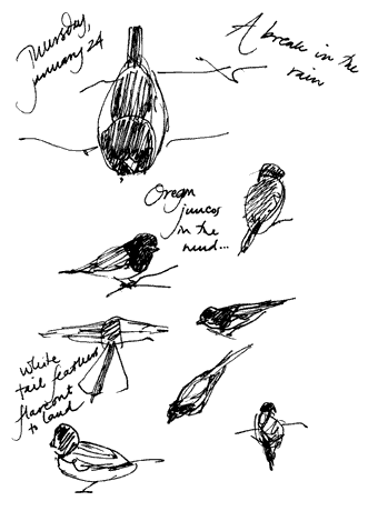 A minor break in the rain: a flock of juncos works busily through the cut branches and mud, looking for new goodies.