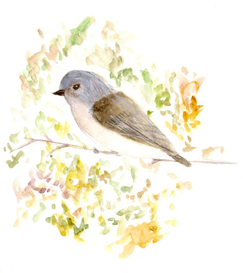 We went out this morning and I saw a bushtit gathering spiderwebs for its nest. There was another one this afternoon doing the same thing, but this time I had my paints.