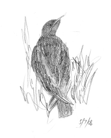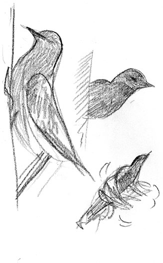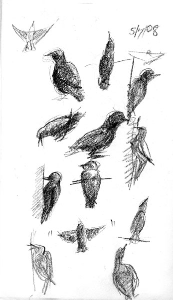 Starlings are ubiquitous here, so much so I almost don’t notice them. But this is an error: an introduced species, they compete for nesting cavities with native birds (some of the sketches at left show a bird at a hole, which it won off a pair of Western bluebirds).