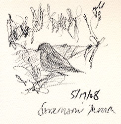 It has cooled down. A Swainson’s thrush was singing outside this morning. I spotted another one here at work while I was on hold on the phone; quickly sketched it.