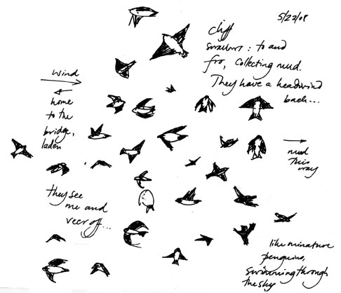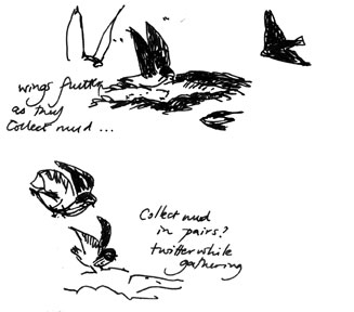 I sat outside last night watching them coming to and from the bridge, collecting mud that is abundant in an area where an underground pipe is burst. Water is precious here and it’s just pouring into evaporation land, something that makes me nuts, but it does make good mud for swallow nests.