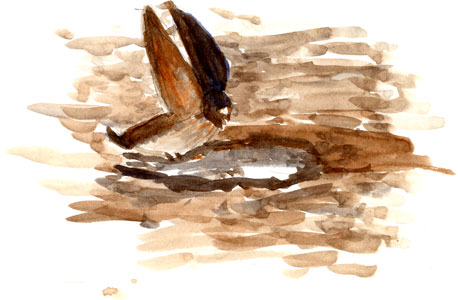 I went over to the mudhole and sat down. Several swallows alit, wings and tail fluttering, while they collected mud bits. I’m not clear the color on the underside of the wing is right, but I think I’ll spend some more time with them later on, as Barry suggests. Till I really know the bird. You might be seeing swallows for a while…