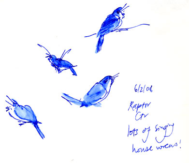 House wren, pen and wash As I sketched (quickly; didn’t want to disturb the bird too much) I heard house wrens — left, right, straight ahead, behind. They are small and it took a while before I found one I could see… But it kept singing and singing till I spotted it. I had no idea.