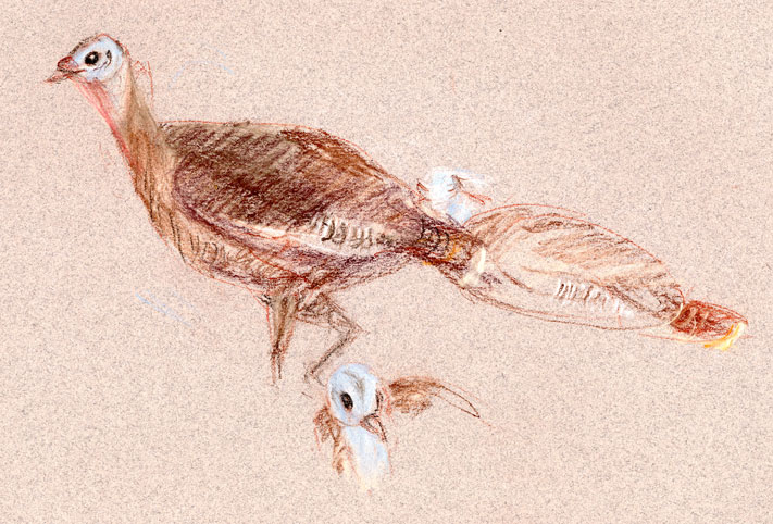 Starlings, magpies: I sketched them too. But when these teenage turkeys settled outside the kitchen window for a nap, I picked up the pastels again. These are the Stabilo Carb Othello pastel pencils, easy to sharpen and a joy to use. It’s good to get back into this.