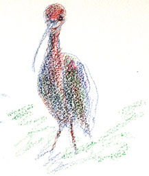 Lunchtime: a large flock of ibis in our flooded field, comparatively close to the kitchen window. I got out the prismacolors. I’m quite enjoying sketching, as opposed to drawing, with them — I used only four colors, terra cotta, indigo, apple green, pink.