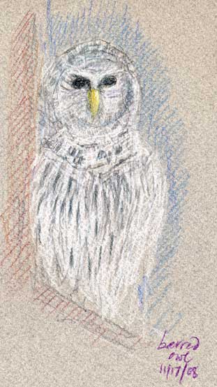 I love owl calls; they are so haunting and lovely. I hear mostly screech owls outside our windows, but occasionally hear the barred and the great horned. Was it fun to do the sketch?