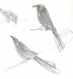 We found some great-tailed grackles in a parking lot in Stockton and drew them. Funky birds, funky tails, funky calls. It was like being back in Texas…