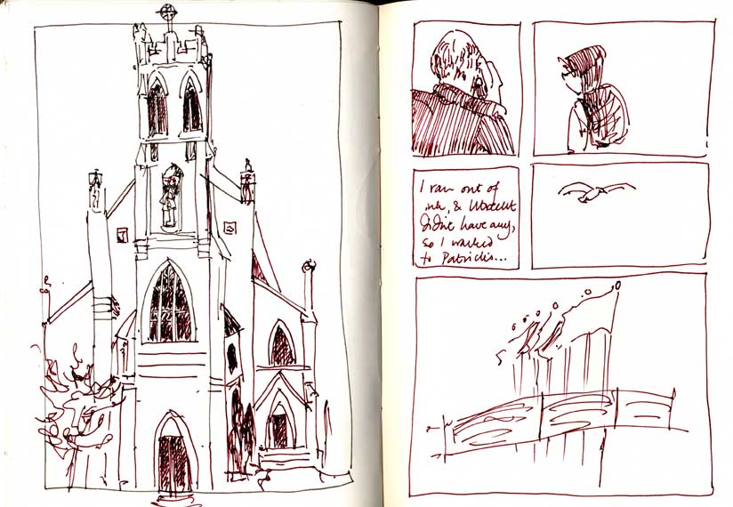 I ran out of ink while I was in the middle of drawing the church near the Moscone Center and had to head out in search of more, a lovely tuscan red Waterman ink I found at Patrick’s on Market. This all doesn’t have a lot to do with Macworld. To tell the truth it was a bit disappointing and I won’t be going back — even if there are any more, which is now a question. It’s the end of an era? Adobe wasn’t there. Wow. That was major. Anyway, I had fun sketching; it was a fantastic day to be on a train and to eat lunch outside, at the fabulous Samovar Tea Lounge, sheltered from the wind.