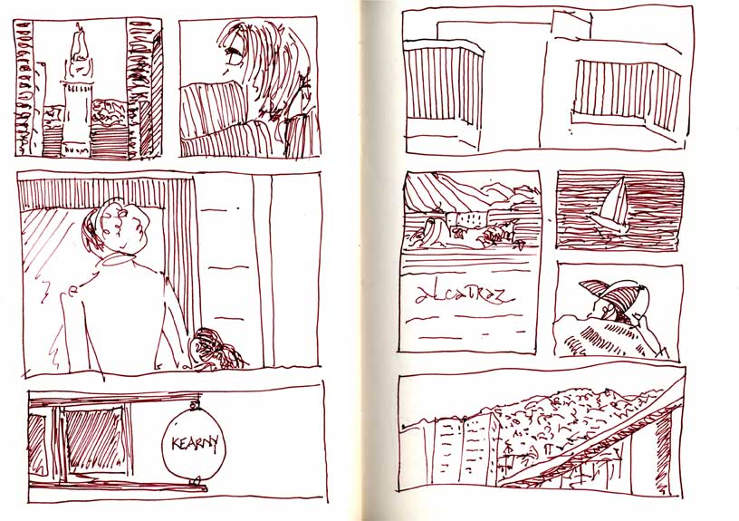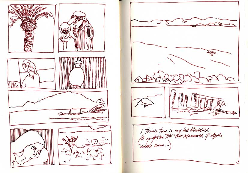 I took a trip to Macworld today on the train, and sketched my way down and back. Given that tomorrow is the 21st (!) worldwide Sketchcrawl, and there will be as usual a large San Francisco contingent, I thought I’d participate in the same spirit but just a day early. Drawing birds from a moving train is a bit of a challenge since the birds invariably move too, fast, away, but it’s a good exercise.