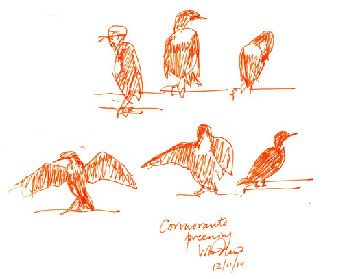 I went to Woodland this morning and, coming back on Road 102, made a quick stop at the pond near (but not at) the Wastewater Treatment Plant. A large mammal (mink? muskrat?) dove as I arrived at the boardwalk. Apart from Canada geese, mallards, and a flock of gulls, there were a number of double-crested cormorants preening in the gloom. No sun today.