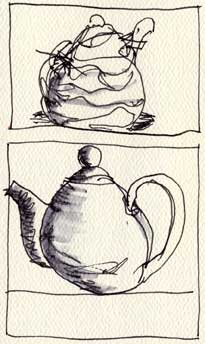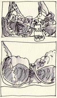 We went to Ripplu, a place Barbara Anderson put me onto: the Japanese bra store. My friend Sue was brave enough to get herself manhandled into a size she’d never even heard of… but they did let me sketch and actually set up a chair for me. Next, Takashimaya, a Japanese department store on 5th Avenue, more museum than shop. We walked all the way down east 59th past the Tassel Store to Terrence Conran’s, where my sister loaded up on Pantone colors and kids’ toys, and where I drew teapots and Phillipe Stark’s alien lemon squeezers. On to Zabar’s on Broadway for cheese and cinammon rolls. Then a different kind of bra fitting experience at Victoria’s Secret. I volunteered for this one. Jeez. We were glad to get home for a cup of tea and a game of Monopoly (we all got creamed by Richard, who didn’t join us on this excursion, lucky for him).