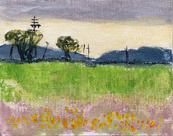 - Very cool to have stood in that approximate spot and to recognize the view. (Also cool how the nearest power pole is the single straight, stand-at-attention, engineered-formal thing in the painting, while everything else looks blown about by wind, biology, and distance. Among other cool things.)— Ron Sullivan 24. April 2006, 10:39 Link