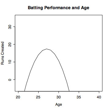 The graph at left is a doubly-averaged concoction. The y-axis measures Runs Created, which is an estimate of the total number of runs that a batter contributes to the team over the course of the season. What I did to produce the graph was to plot for each of the batters in my cohort RC against age and then fit a linear regression model with a quadratic term against the plot. This model generates a graph that is an upside-down parabola, the maximum of it falling at the age of the batter’s peak performance. I then took the equations for the entire set of batters, and averaged their coefficients together in turn, to produce the graph here, which is a composite look at the batting performance across the entire cohort.