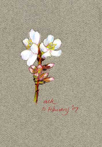PS: At right is an almond blossom I drew for Jennifer, whose birthday is today (February 10) and who is dealing with freezing temperatures in Sweden: Happy Birthday, dear Jennifer! The original’s on its way…