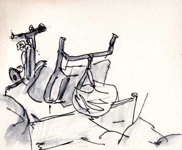 I had no camera with me but happened to have a sketchbook in my pocket. It gives no sense of the multiple electrical cables or the perspex divider between the front and cargo section which doubles up as a tandem spot. (Our young friend said there was also a roof which wasn’t attached because it was 75 degrees today, sorry those of you in chilly climes.)