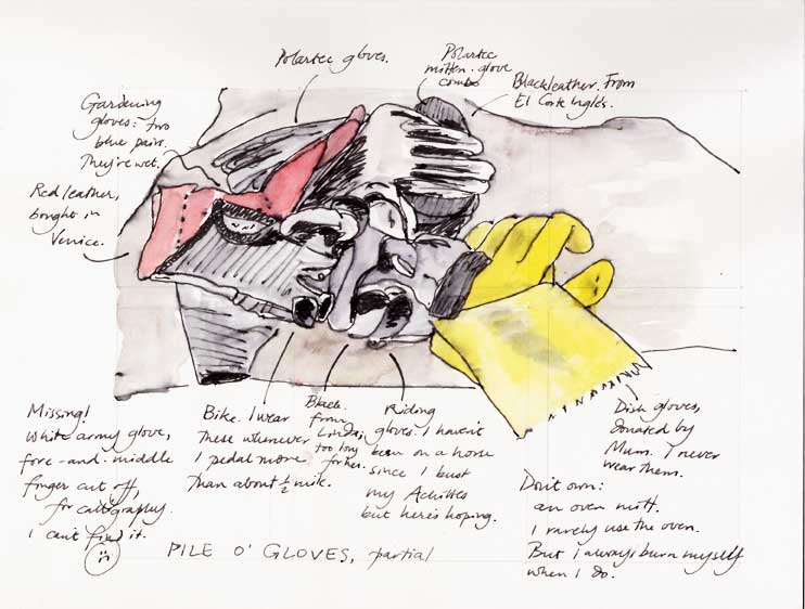I’ve been shoveling a lot of manure over the past two weeks; if I didn’t wear gloves, I’d have some serious blisters. My gardening gloves are alternately sopping wet or crusty-dry. I wear gloves to drive, to bike (let’s hear it for terrycloth), to walk; to do calligraphy (a jerryrigged military dress glove with the thumb, forefinger and middle fingers cut out — the idea is to avoid putting grease from your hands onto the paper); I have gloves in the pockets of all my jackets. I have lots of leather gloves mostly bought in Spain (a pair my father brought me back from his last trip there, for instance). When Numenius isn’t looking, I use them to clean my binoculars on rainy days. There’s a box of vinyl gloves under the bathroom sink. (These come in handy for when you have to move a dead magpie to the freezer in the women’s room at work.)