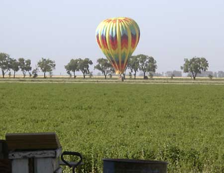 I have yet to figure exactly where these balloons are based, but they seem to launch from near Woodland which is about 12 miles from here on clear, calm early mornings in spring and early summer. I think there are four balloons in their fleet. Usually they drift south. Yesterday they landed nearby, one of them landing in the field directly to the south.