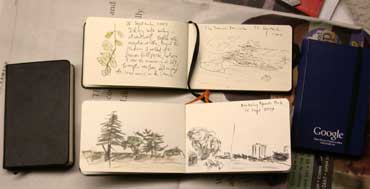 We find Moleskine notebooks to be well-put together, but too much of a cult object to go off and purchase them. Fortunately, there are a good set of imitators on the market now. Here are some I’ve acquired in the past couple of months. At top is my sketch-a-day notebook, with a couple of drawings from my trip this week to Victoria, British Columbia. At bottom is another landscape format notebook I picked up at our latest visit to the art store. At left the notebook I was taking notes in at this week’s conference. And at right a freebie I picked up during said conference.
