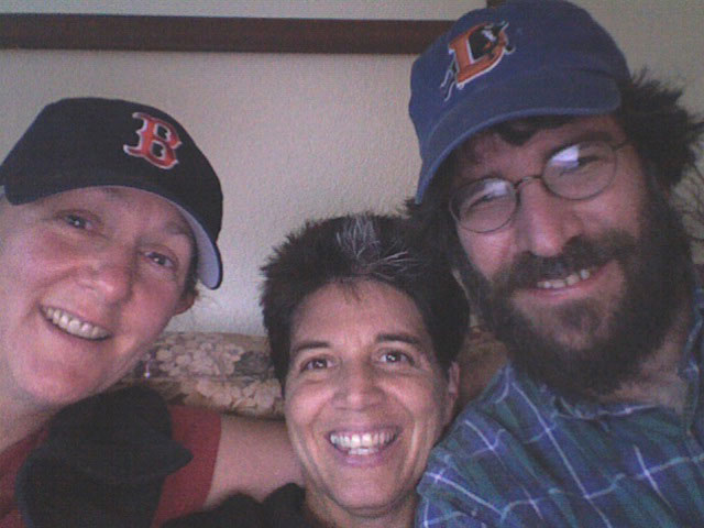 We watched the game over at our friend Chris’s house, who managed to share the experience with her sister Sue in New England via webcam. At left is an image of Pica, Chris, and me taken early in the game.