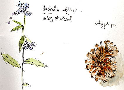 This is the fourth time we’ve done this overnight outing, this time staying in a motel in Portola yesterday evening. Here are some sketches from our trip. At left is a scene from Sierra Valley, and at right are a couple of botany highlights from Yuba Pass.