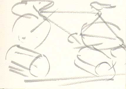We finally made it to the exhibit today and were quite impressed by the collection, which ranges from the 1823 draisienne with no pedals (you sat over the frame and pushed it along) to the latest design in streamlined human-powered vehicles with a full fairing. What struck me was how little bicycle design has changed in the past century. Once the safety bicycle came along in the 1880s and pneumatic tires were added shortly after that, the bicycle looks quite modern. One of the bikes in the collection was a track bike used by the great American racer of a century ago Major Taylor, illustrated above. The lines of the bike resemble any track bike of today, though the wheelset was made of wood and he trained on a particularly massive set of wooden rollers (as seen below the bike in the illustration).