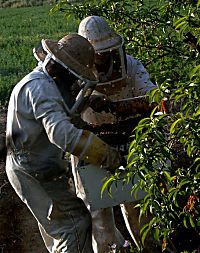 Lisa over at How’s Robb reported yesterday on her adventures in joining some beekeepers who were catching a swarm in a yard in the Oakland Hills; today we got to witness the same process, but out our kitchen window. Our landlord’s son is a beekeeper with a pretty substantial operation that is partly based out of a workshop that is around back where our house is. This past few weeks he and his assistants have been extremely busy building up beehives and starting to truck them around places. When Pica got home today, she saw that there was a swarm of bees in the peach tree just north. The beekeepers didn’t take long to collect it, as shown at left.