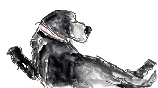 A lovely spring day today, though with the ongoing tornado outbreak in the Central Plains I am reminded that lovely weather in one place is always balanced by horrific weather somewhere else. We had our monthly sketchcrawl today in Davis, walking a four-block stretch on G Street downtown. I mostly worked large today, using a 9 × 12” pad of watercolor paper I picked up last time I was in Berkeley. Above at left is a black lab named Eliza who was outside at the Davis Food Coop. And at right is a gentleman with his coffee in Mishka’s.