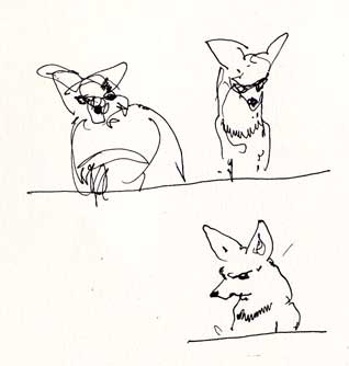 This sketch is of the mother who climbed a toyon tree to get onto a sea container in order to put us under surveillance last night. We made very quick sketches and backed away, not wanting to put her under any more stress. The pups, two of them, played happily in the twilight… Hope they stay away from the road and that they get enough to eat.