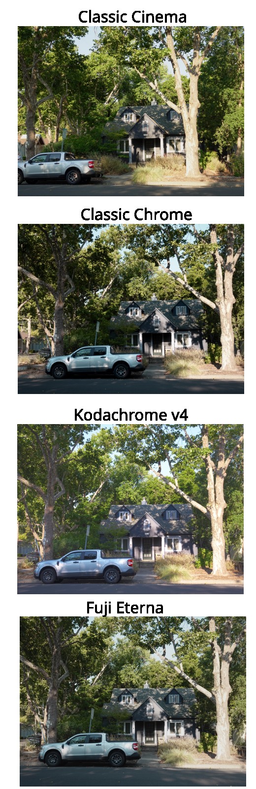 I am now deep into the project of figuring out which film simulation profiles to select for my little Sony ZV-1. As previously described, there are about 85 profiles in the recipe book, and the camera has slots for 10 of them at a time. I’ll need to pick and choose. Basically I want to cover a range of styles. Of the 10 slots, I will reserve one for scratch, and two of them will be monochrome styles: one low-contrast, and the other high-contrast. This leaves seven for color profiles. The way to figure which to choose is to do lots of testing. So now when I go for my morning and late-afternoon walks I load up the camera with a new profile and take some pictures using it.