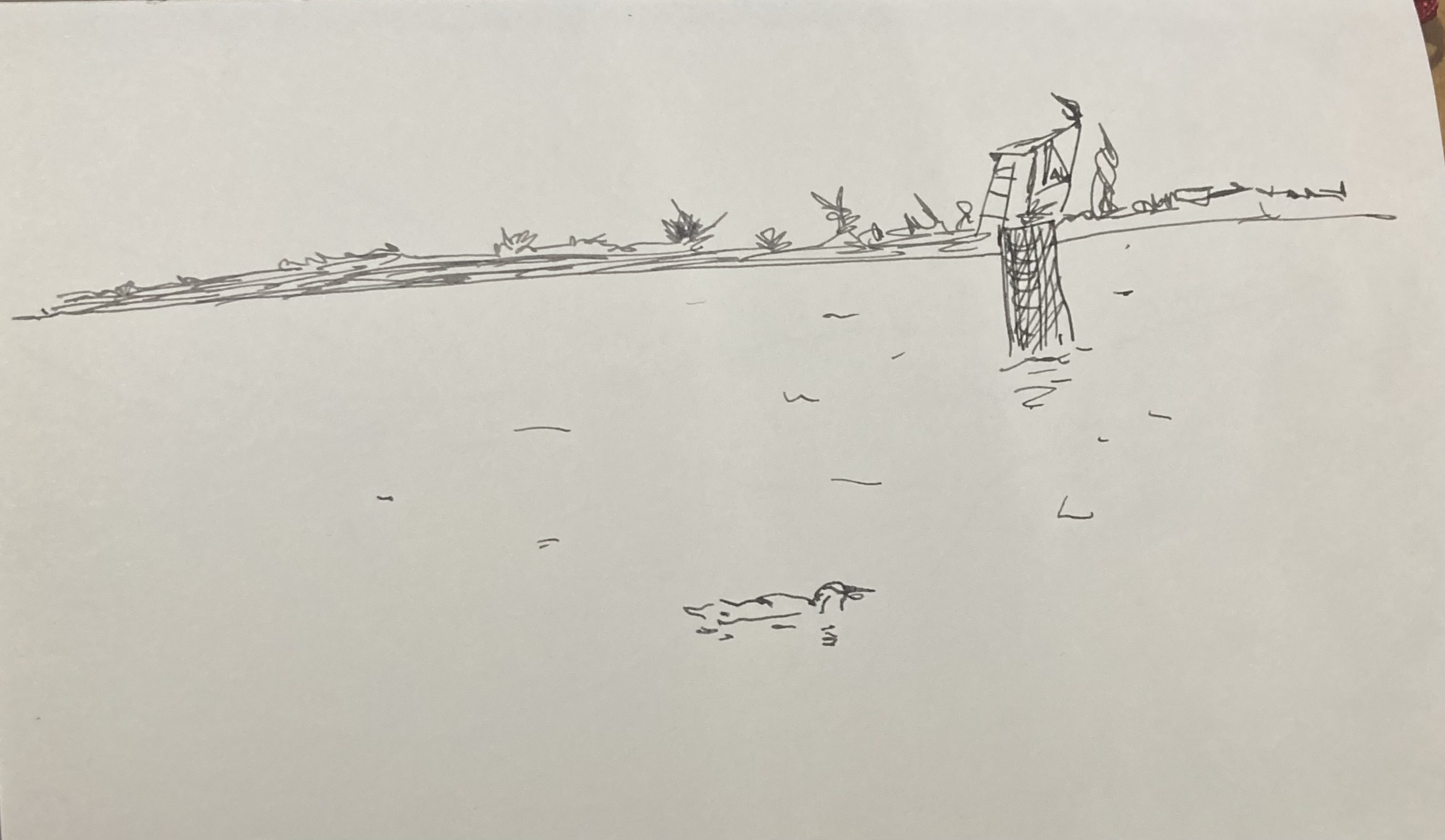 There was no way I was going to find somewhere to eat with the gathering throngs so I went out on the balcony at the Tides inn to do a sketch or two… A loon was fishing near the dock. Loons had been calling across the Bay when we set her ashes down in Maine. It closed the circle a bit.