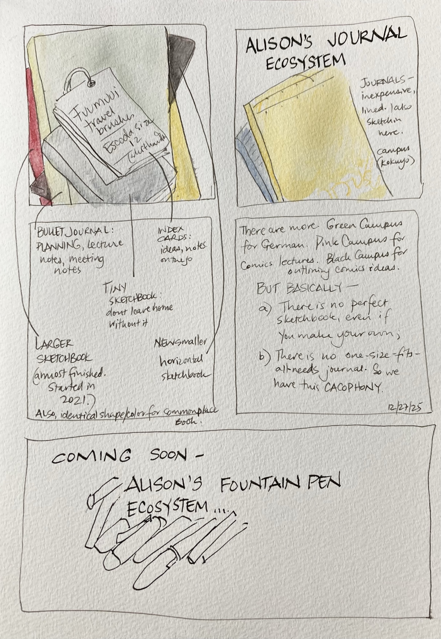 I made a drawing yesterday about my journal ecosystem… missing even from the list of missing items are my knitting journal and my nature journal. I ought to redo this drawing to include them all.