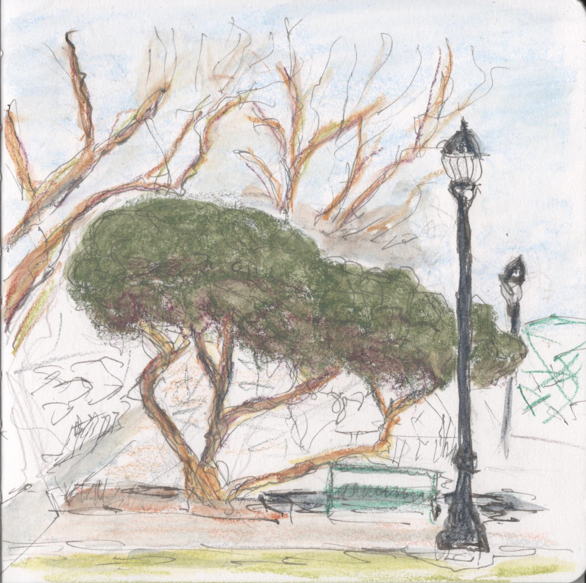 For today’s urban sketch, I walked a few blocks down to Central Park in Davis and settled down in front of this interesting tree. This was sketched with ink and Neocolor II aquarelle crayons.