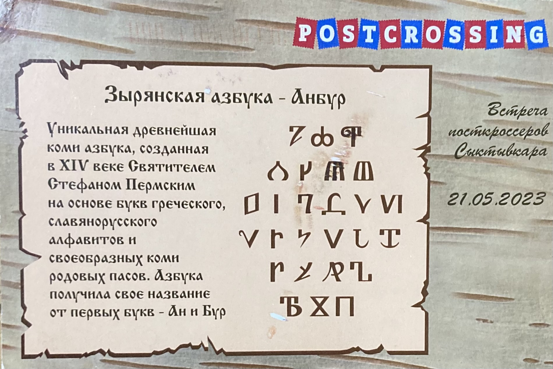 On the postcard you can see the ancient alphabet of the Komi people. It’s called Anbur. This alphabet was created by St. Stephen of Perm more than 600 years ago. The first books that were written in these letters were the Psalter and the Gospel.