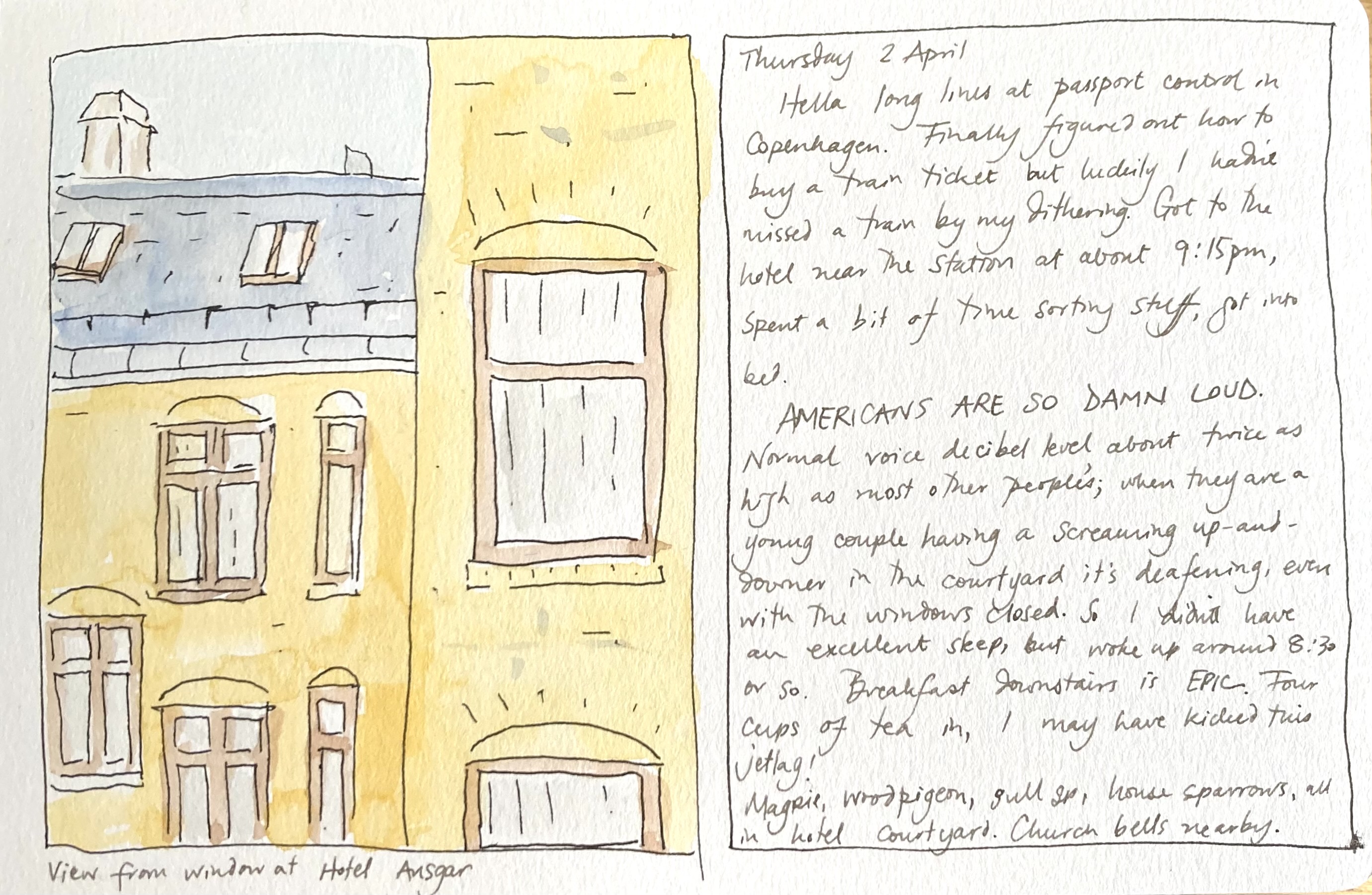 On the first night of my recent trip I arrived in Copenhagen (a long, long day: a train ride, a BART ride, a transatlantic flight, a second flight within Europe, a long line at Danish passport control, another train ride into the city: you get the idea). I was exhausted, wanting nothing more than to fall into bed in a hotel room which was way too hot. So I opened the window.