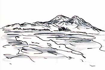 Today I took the train down to Berkeley to have brunch with my family. (Pica joined us in Berkeley after staying overnight at her mum’s in Bodega Bay—it was something of a family weekend for both of us.) The train ride offers good views of rural Solano County, and to the south Mt. Diablo (3849 feet high) in Contra Costa County is ever present. At left is a sketch of the peak looking over the Suisun Marsh.