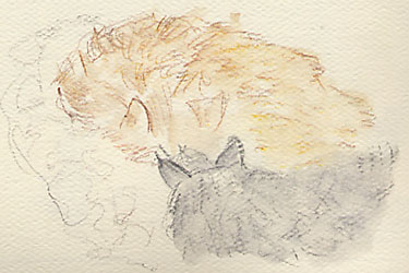 Before we spent a couple of hours yesterday standing in line at the Oakland Museum, we stopped off at the art store at the foot of University Street in Berkeley, where I picked up a set of the new Derwent Graphitint pencils. These are water-soluble graphite pencils that have some colored pigments thrown into the mix. They’re intriguing pencils, with a subtle color range, good for landscapes, with the colors becoming more vivid when wetted with a brush. Above is a sketch of Charlie and Diego snoozing on their kitchen countertop mat.