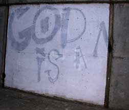I’ve been puzzling over this graffiti which is by the bike path underneath the freeway near the UCD Arboretum for some time now. Browsing through my copy of the Oxford Dictionary of Astronomy this evening an answer came to me. The upside-down V must be a capital lambda and the statement would be a reference to the cosmological constant.