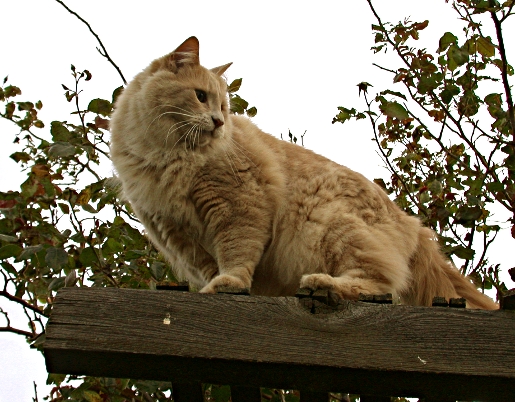 She came up to me one night, obviously looking for affection. From the woman who hurled blue frisbees at her. I petted her, then, feeling two hair mats on her neck, fetched a brush. She purred louder than any cat I’ve heard. Yeah. Right. Feral.