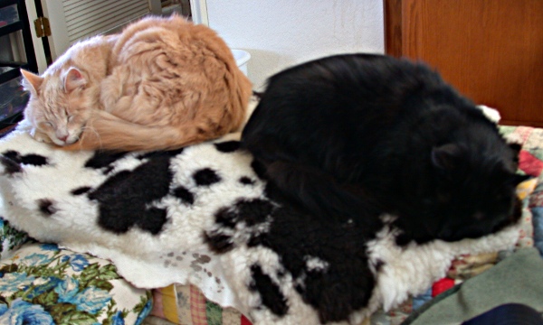 The cats enjoy the sheepskin that Pica picked up for them last week at the sheep shearing.