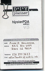 As Pica related, last week we discovered the hipsterPDA and the Getting Things Done (GTD) system for productivity. It’s too early to say if the hipsterPDA is a personal reform that will be long lasting, but all signs are good. There are three reasons why I think this is working for me. The first is that it is small and very easy to carry. Any binder-based organizer however compact gets bulky quickly—it’s not something you’ll bring to the ballpark or many other places. The second is that the system is analog. I’ve done enough time with a Handspring Visor PDA to realized that there is a lot of overhead with digital organizers. Finally, the GTD system makes a lot of sense to me. Pica has worked with Franklin Planners on and off for many years and I just can’t see using one. There is too much emphasis on priority setting within a daily calendar. The GTD system is by contrast bottom up—you track projects and next actions, and the calendar is reserved for actual appointments. I’m having fun with all this, which is very promising.