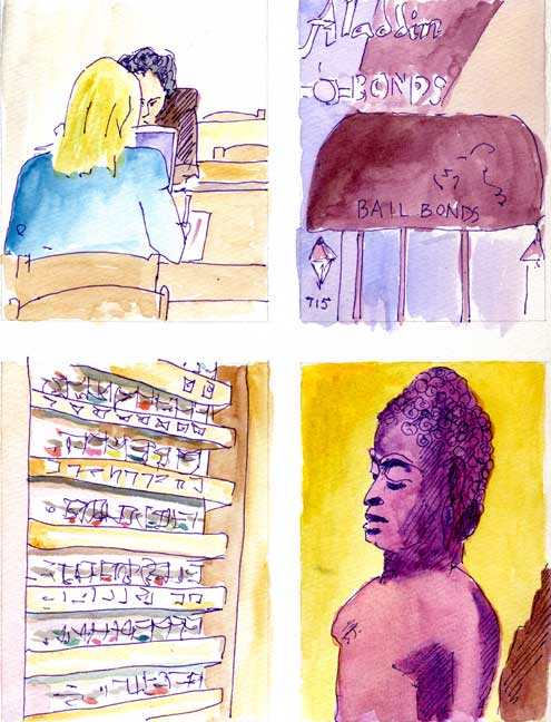 We went for a quick hot chocolate to the Temple Cafe (open 365 days a year, equal opportunity to all religions) and moved on to the library, where we spent a pleasant hour or so browsing and sketching. On to Art Ellis for some watercolors, rice paper and bookcloth (N took a quick detour to the electronics store), and we ended up at the Crocker Art Museum for a look at the Buddhas exhibition which was excellent and is now in its final week (it ended up being, for me, a crash course in the history of Buddhism, well worth it for that reason alone, but some of the pieces were stunning; I particularly loved the calligraphed palm leaves).