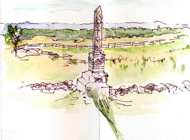 I sketched at Little Round Top and from Cemetery Ridge, looking down on the field with fences faced by Pickett’s division, marching double time up into Union canister. Ghosts.